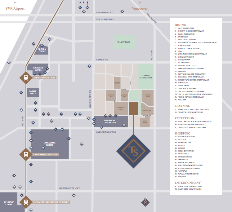 Trafalgar Square by Polygon-a collection of sophisticated urban apartment residences in Richmond’s highly sought-after Alexandra Gardens neighborhood. Hundred of fashionable shops and restaurants are within walking distance. An exciting address with exceptional extras, including exclusive membership to the residents only Trafalgar Club. Close to Wal-Mart, restaurants, banks and schools.