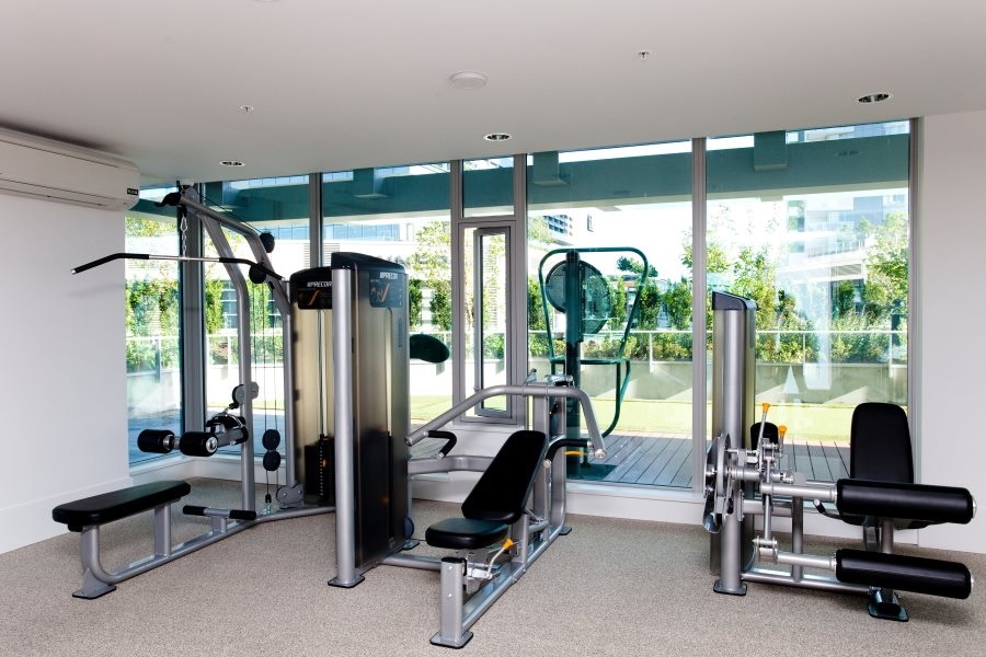 ▪ North Tower ground floor fitness centre with meeting rooms. South Tower rooftop amenities include a lounge, fitness centre, zen garden, putting green, urban agricultural plots, and greenhouse.